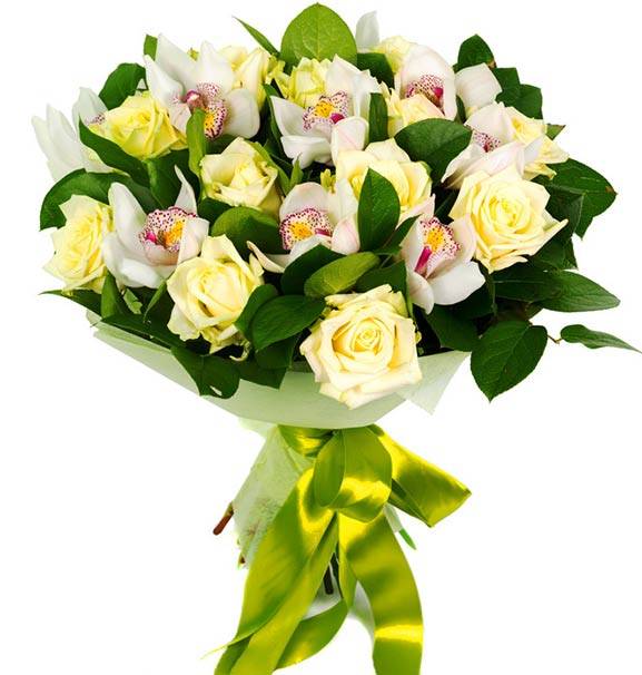 Орхидеи, которые являются основными в этой цветочной композиции, - это символы элегантности и совершенства, а их изысканный белый цвет делает букет еще более нежным и трепетным. Розы нежно-желтого оттенка помогут выразить ваше признание и восхищение, а использование при создании композиции листьев салала насыщенного зеленого цвета делают букет более ярким и выразительным. С помощью этой непревзойденной и невероятно нежной композиции вы непременно сможете подарить получателю море позитивных эмоций.